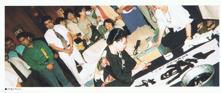 | トルコのイスタンブールで五月末に開かれた「イスタンブール・ジャパンフェスティバル一九九四年」に参加した。 日本からの参加総数は千二百四十人で、うち私を含め書道関係は四十人だった。 時差六時間、所要時間は所要時間は約十二時間である。 同行の海部俊樹元首相は、十年前は二十四時間かかったが、日本とトルコはこの十年間で大変近くなった、と話された。滞在中は晴天に恵まれ、アジアの街並みとヨーロッパの市街風景がみられた。 イスタンブールの朝は美しい。モスクから流れてくる祈りの声で目を覚ました。 トルコは大変なインフレ。トイレに入ると五〇〇〇トルコ・リラ、ビールは七万リラ、美術館で求めた小さな本が二〇万リラ。私が飲んだビールは二百三十三円くらいになる。 弘前の自宅を出発するとき、治安の面で心配したが、空港到着から警備の警官が前後、左右につき、船に乗ると護衛艦がつき、あまりの気の配りように申し訳がないように思ったほどだった。 町ではロングのワンピースで歩く若い娘、スカーフをかぶった女性、時には黒で身を包んだ女性、彫が深くヒゲをたくわえた男性……。女性も男性も美しかった。 トプカプ宮殿の庭での前夜祭では日本酒の鏡割りが行われた。そしてフェスティバルの開幕。 私たちの書道コーナーには多くの人たちが集まり、それぞれ筆で名前を書き、また、好きな一文字を書いた半紙を大切にしまっていた。お土産に準備した「うちわ」や「はし」に大喜びだった。 デモンストレーションの時間になり、私は二尺に八尺の大画仙紙に「春蘭秋菊」「花意竹情」の四文字を書いた。二日目には「柏葉寿」の三文字。大筆で全身で書き上げた。割れるような拍手に、しばし自分を忘れた。 米国、中国でも揮ごうしているが、トルコの人たちの前での揮ごうも、又違った意味があるように感じた。私の作品に私の作品に雅印を押してほしいと、どこまでもついてくる人もいた、高校や大学の日本語課の生徒さんが、四国・松山出身の女性の先生と一緒に会場に来て、盛んに書に関心を示していた。 トルコと日本のきずなをより深くする国際交流の役目を、書を通して果たせたと思っている。 |